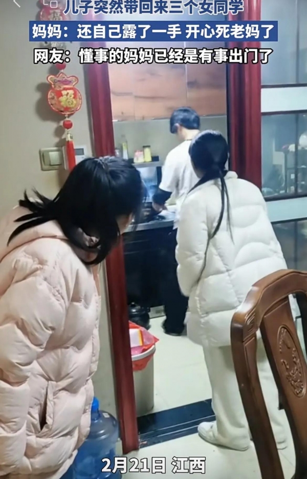 2月21日,江西,一位妈妈分享儿子突然带回三个女同学,他亲自下厨给她们做饭菜。网友吐槽,懂事的妈妈已经有事出门了。