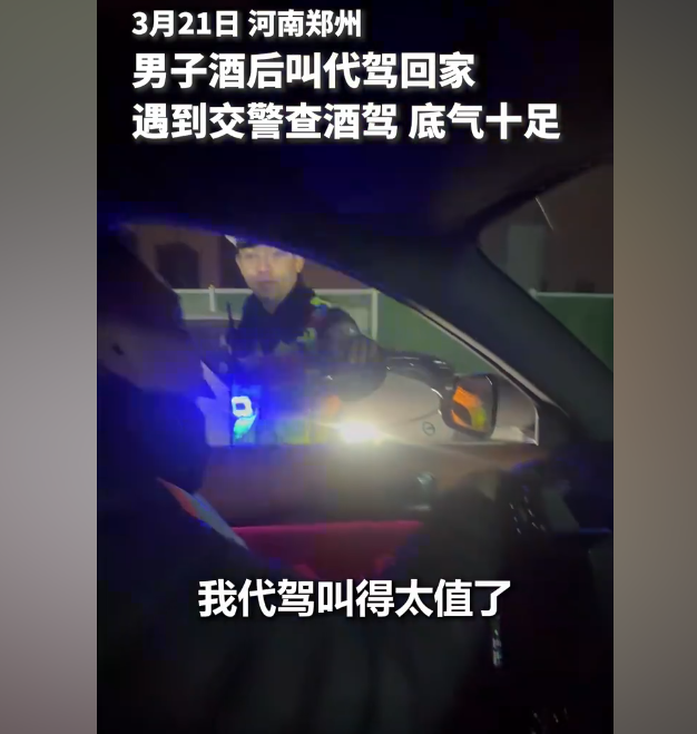 3 月 21 日晚,河南郑州街头发生了一幕让人忍俊不禁的执法场景。一名男子酒后自觉叫了代驾送自己回家,没想到途中恰好遇到交警夜查酒驾,面对民警的检查,他不仅没有丝毫慌乱,反而底气十足,甚至还要求让自己也吹一下,笑着感叹:"我这代驾叫得太值了!"