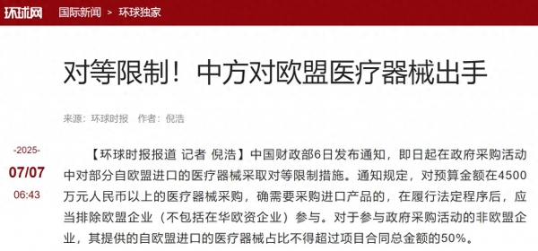 而限制欧盟进口医疗器械就更不用说了,欧盟无理挑衅在先,限制中企参与欧盟医疗器械公共采购,中方多次沟通,但是欧方一错到底,中国不得不采取对等限制磋商。