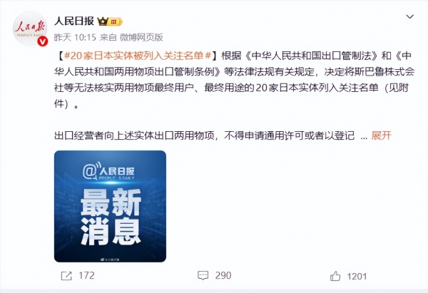 2月24日,正值春节假期后全国复工复产的第一天,我国商务部率先发力,发布重磅公告,正式将三菱造船株式会社、川崎重工航空宇宙系统公司等20家参与提升日本军事实力的日本实体,列入出口管制管控名单。