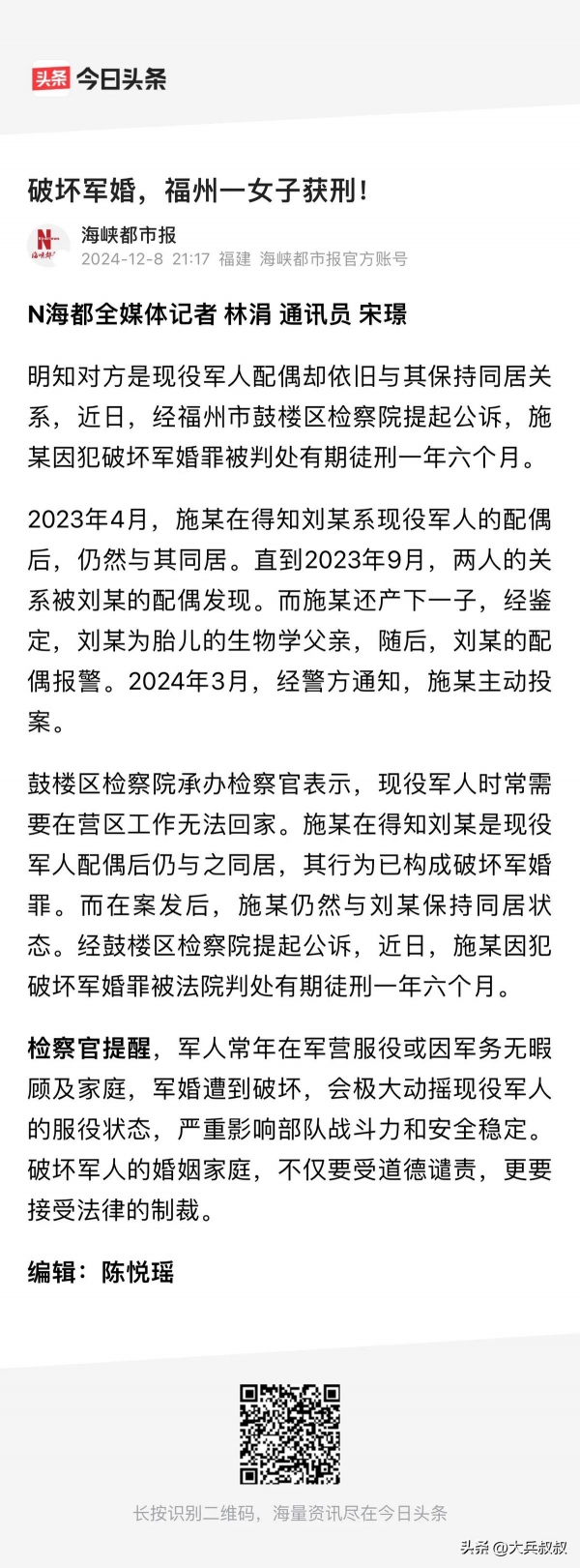 这事儿,给咱们敲响了警钟。婚姻是神圣的,更别说军婚了。别为了自己一时冲动,毁了别人家庭,也毁了自己。这年头,法律可不是闹着玩的。这姑娘的下场,就是最好的例子。 这事儿,提醒大家,做人要守规矩,别想着占便宜,最后吃亏的还是自己。 这案子,算是告一段落了,但它留下的教训,却值得我们好好反思。