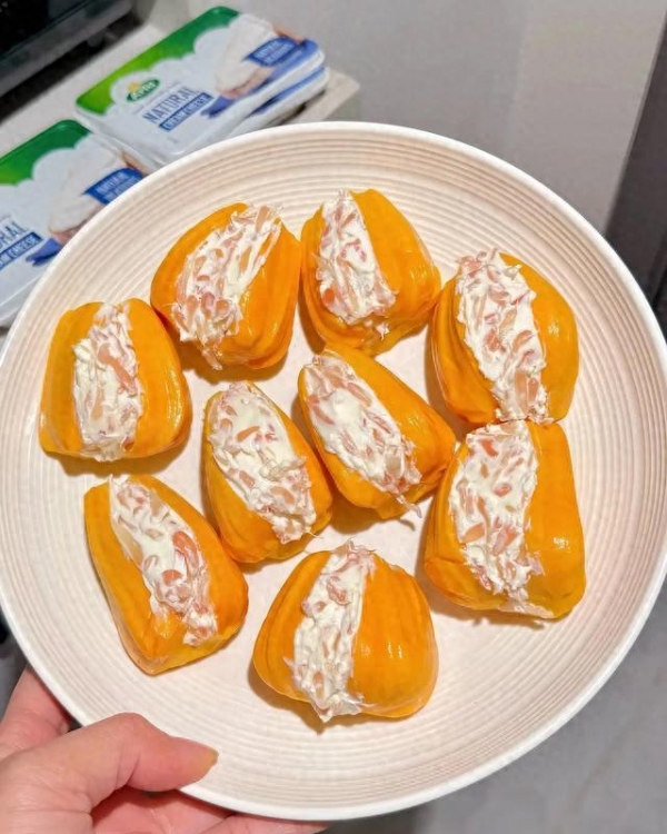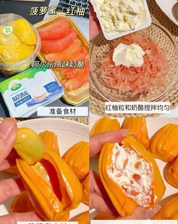 做法简单,只要将菠萝蜜去核挤上奶酪,再加入柚子粒,白白胖胖的小点心就搞定。
