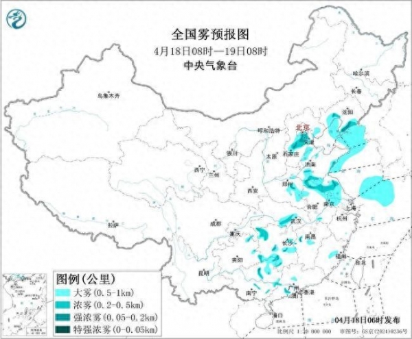 中央气象台4月18日6时继续发布大雾黄色预警:预计,4月18日8时至19日8时,渤海北部、渤海海峡、黄海大部海域、东海西北部海域将有能见度不足1公里的大雾;此外,4月18日早晨至上午,辽宁南部、北京南部、天津西部、河北中部、山东西北部和南部、河南中东部、安徽中西部、江苏中北部、湖北中部、湖南中西部、江西中部、广西中东部、广东中部等地的部分地区有大雾,局地有能见度不足200米的强浓雾。