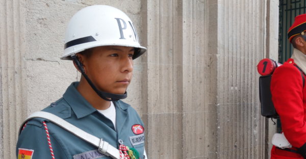 笔者随手拍的唯一一张照片里,礼仪宪兵军服上的右肩章就掉了(肩袢未系住扣子),而且用武装带肩带压着(笔者之后与玻利维亚人查证过,玻军肩带应从肩袢下穿过)