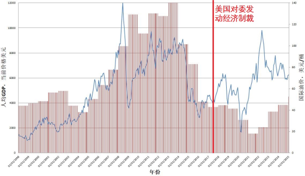 红色柱图为1998年至2024年的委内瑞拉人均GDP,蓝色折线为国际油价,注意前者的崩溃(2014-16年)远早于美国制裁(2017年后)。"万事搞垮赖制裁"本质上不过是无脑崇美的另一种表现。