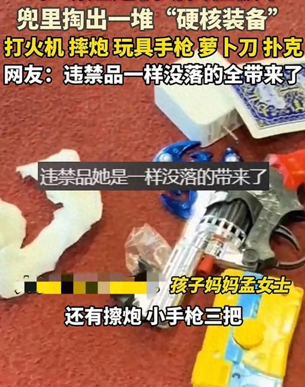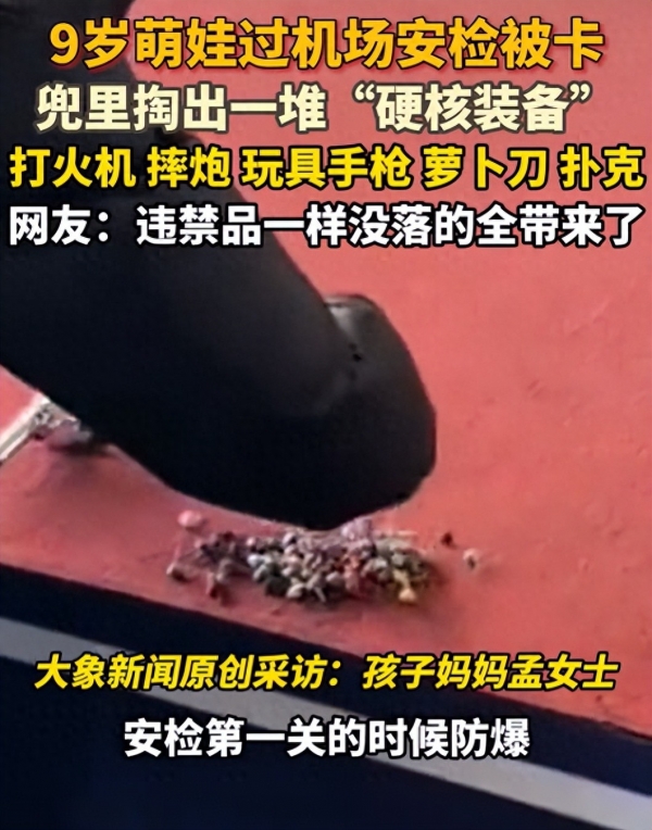 这些物品看似普通,甚至不被大多数人所注意,但一旦置于机场安检这样的严苛环境下,这些物品瞬间变成了一个个潜在的"威胁"。从打火机、摔炮到玩具手枪、萝卜刀,一系列物品像魔法一样从小孩子的口袋中源源不断地被掏了出来。有人说,这孩子怕是把所有的"武器库"都搬进了机场!
