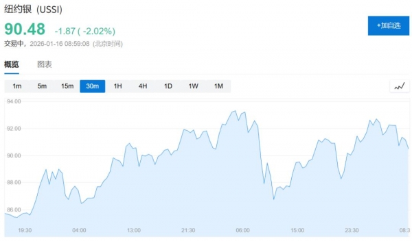 现货白银周四在亚市盘初涨至93.75美元上方,连续第四日创盘中历史新高,亚市早盘即转跌并保持跌势,亚市盘中刷新日低时跌至86.40美元下方,日内跌近7.3%,美股午盘跌幅收窄至2%以内。