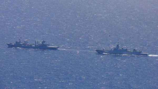 中国海军微山湖号综合补给舰(左)和遵义号驱逐舰(右)在塔斯曼海航行。(图源:澳大利亚国防部)