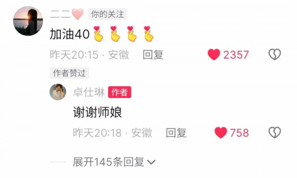 不仅如此,卓仕琳的视频评论区,小杨嫂还留言说"加油40",配了几个比心的手势。