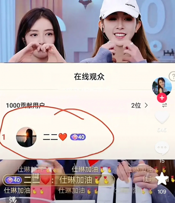 小杨哥的老婆小杨嫂也在卓仕琳直播的时候给她刷礼物力挺,直接刷到1000贡献榜榜一的位置。
