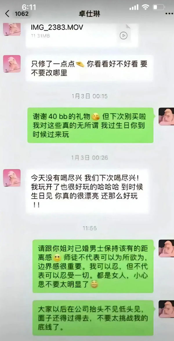沫沫前老板爆料后,网上又流出一张疑似卓仕琳和小杨嫂的聊天记录截图。截图里确实出现了卓仕琳的昵称"40",小杨嫂还提醒卓仕琳对已婚男士要保持距离感,说师徒并不代表可以为所欲为,"都是女人,小心思不要太明显了"。最后还警告卓仕琳,不要太挑战她的底线了。
