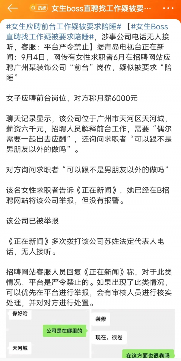 "你一般可以跟不是男朋友以外的做吗?"太离谱,一个月工资6000,女性求职者应聘广州某装饰公司前台被要求"陪睡"。