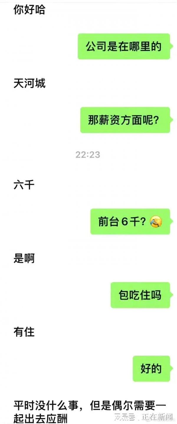 面试过程中,招聘方提出了岗位的职责,其中包括"偶尔出去应酬"。这一说辞已经足够让人怀疑,但更让人愤怒的是,招聘者直接抛出露骨问题:"可以跟不是男朋友以外的人吗?"--这话的暗示意味已经十分明显。