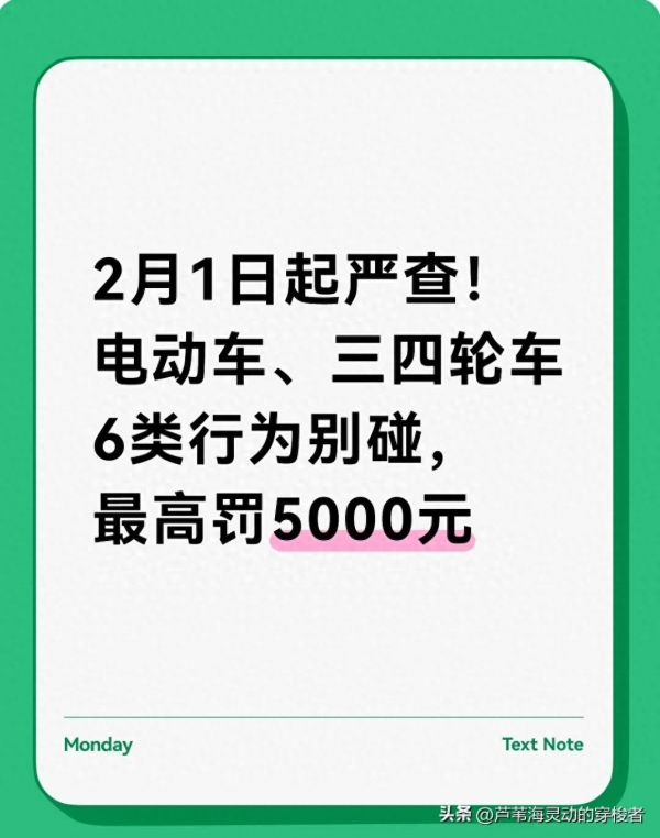2026年2月1日起,全国多地交管部门启动电动车、三轮车、四轮车专项整治行动,6类常见上路行为被明确列入严查清单,处罚标准从几十元到5000元不等,部分违规行为还会面临扣车、拘留等处罚。这次整治不是短期行动,而是覆盖城区主干道、社区周边、城乡结合部的常态化执法,不管是日常代步的电动车车主,还是拉货、接送老人孩子的三四轮车使用者,都得提前摸清规则,避免踩坑。