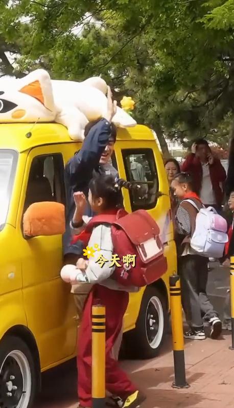视频中应该是剧里的一个片段,他开着黄色小面包车等待接女儿放学,女儿放学后,他将精心挑选的礼物送给女儿,原来今天是女儿的生日。