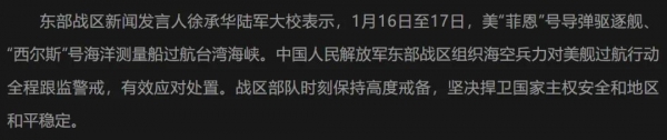 1月17日晚,东部战区的一则通报打破了夜的宁静。发言人徐承华大校证实:1月16日至17日,美"菲恩"号导弹驱逐舰与"西尔斯"号海洋测量船过航台湾海峡。