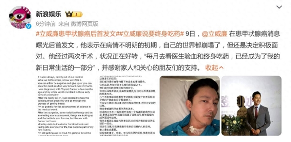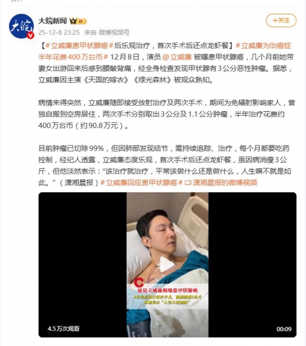 12月9日,曾主演《天国的嫁衣》《绿光森林》的"偶像剧王子"立威廉,在患甲状腺癌的消息曝光后首次发文,一句"每月去看医生验血和终身吃药,已经成为了我的新日常生活的一部分",瞬间冲上热搜,也让无数观众心头一紧。
