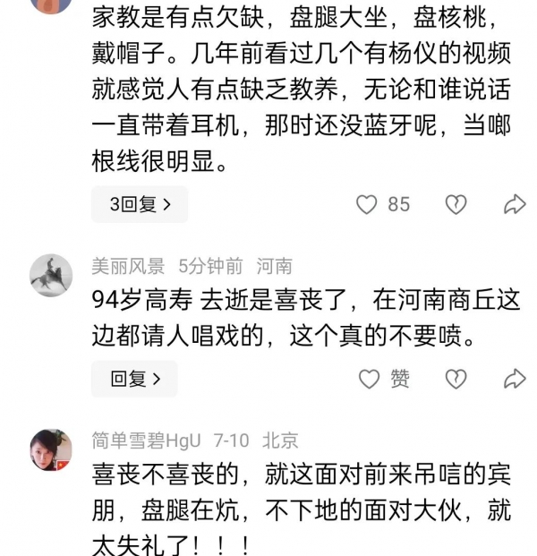 从网友曝光的视频里能看到,杨议双腿盘坐在罗汉床上,手里不停地盘着核桃,一副优哉游哉的样子。在大伙的观念里,灵堂是个庄严肃穆的地方,孝子贤孙应该守在灵前,表达对逝者的思念和不舍,杨议却在休息室里盘核桃,这实在是让人难以理解,甚至有人觉得他这是对父亲的大不敬。