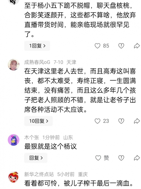 面对网友们铺天盖地的指责和质疑,杨议没有出来解释,也许杨议当时心里也非常悲痛,毕竟,每个人面对亲人离世的反应都不一样,不能仅仅根据这些表面现象,就给杨议贴上不孝顺的标签。