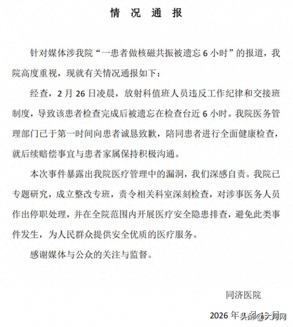 3月12日,华中科技大学同济医学院附属同济医院(下称同济医院)涉事医生回应记者,她和同事交接班失误,两人均被停职,科室已整改。