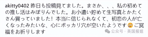 美穗是我第一个偶像,我当时攒了好多零花钱买你的周边和照片,真的不敢相信,就像初恋的恋人离去一样,心里留下一个无法弥合的洞。一路走好。"