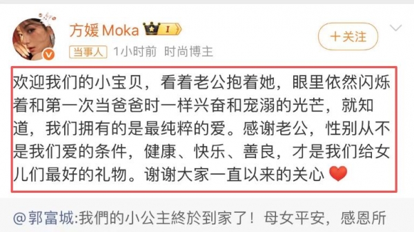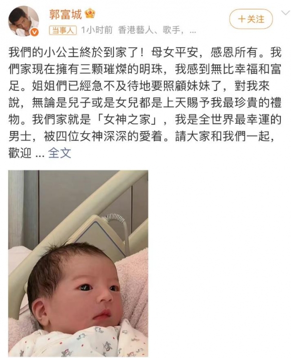 10月22日下午,郭富城发文官宣:我家的三公主出生了,希望大家一起迎接她的到来,祝她健康成长。