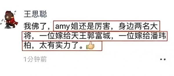当年潘玮柏和宣云官宣结婚时,王思聪在网上评论说"Amy姐太厉害了,手下的两员大将一个嫁给郭富城,一个嫁给了潘玮柏,牛"!