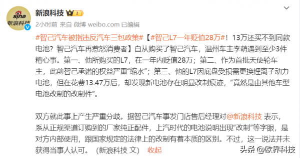 今日@新浪科技报道一则关于智己L7的消息,温州车主李萌自从购买了智己汽车,就频频发生影响心情的大事件,首先是作为首批天使轮车主,此前智己承诺的权益严重"缩水";其次是他所购买的L7,在一年内贬值28万;最严重的事件还是他的L7因底盘受损需更换锂离子动力电池,但在花费13.47万后,却发现新电池存在明显改制痕迹,"竟然是由其他车型电池改制的改制件"。