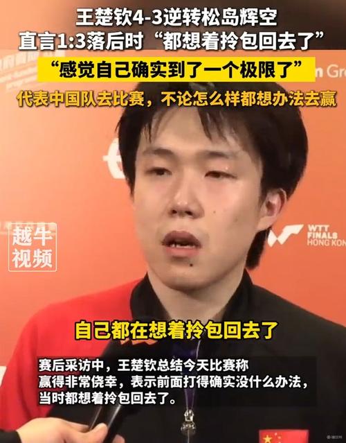 北京时间12月10日晚,世界乒乓球职业大联盟(WTT)香港总决赛男单首轮比赛中,王楚钦以4比3击败日本选手松岛辉空,晋级八强,这场胜利来之不易,王楚钦在大比分1比3落后的情况下,连赢三局实现惊天逆转!更令人动容的是,赛后王楚钦坦言自己在比赛中一度"都准备拎包回去了",并直言近期自己的精力体力"已经到了一个极限"。