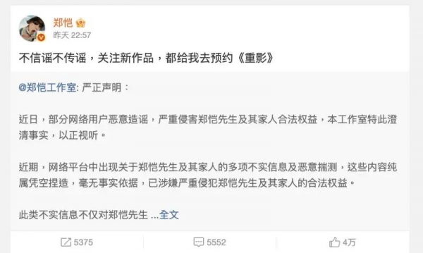 郑恺否认小姨子豪刷传闻 工作室声明将採法律途径