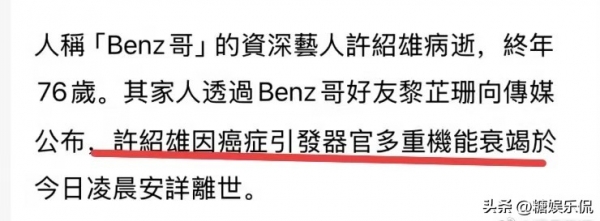 据港媒报道,28日凌晨,许绍雄因癌症引发器官多重机能衰竭,在家人的陪伴下安详离开,愿一路走好。