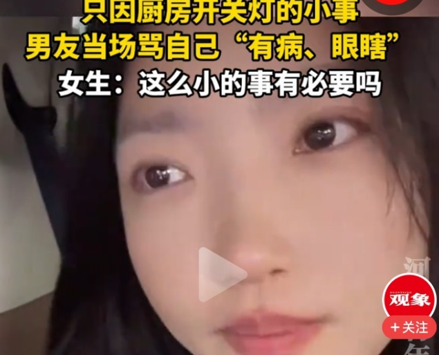 男友让她把茄子蒸一下,女生走进厨房,发现灯开着,顺手关了下开关。没想到,男友突然冒火,骂她"你眼睛瞎了吗?"女生听了顿时心凉,觉得为了这么点小事,男友竟然出言不逊,实在难以接受。