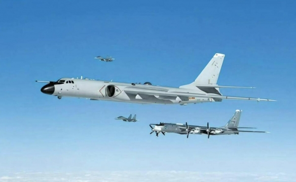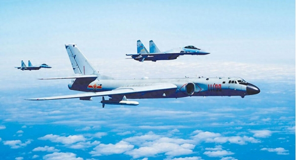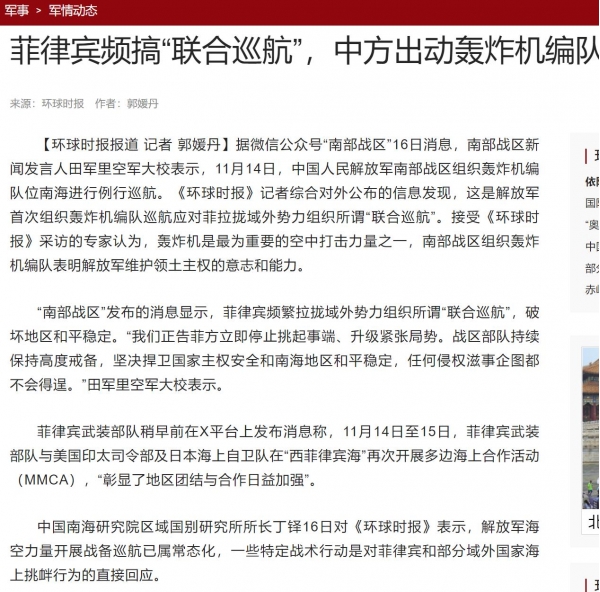 就在美日菲在南海搅局的同一天,解放军南部战区出动轰炸机,在南海空域进行了战备巡航。