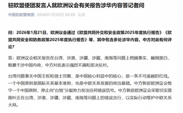 台湾问题事关中国主权和领土完整,是中国核心利益中的核心,是一条不可逾越的红线。一个中国原则是国际关系基本准则,也是中欧关系发展的政治基础。中方敦促欧洲议会恪守一个中国原则,停止向"台独"分裂势力发出任何错误信号。中方敦促欧洲议会采取切实措施纠正在台湾、涉港、涉疆、涉藏、南海等问题上的错误言行,以实际行动维护中欧关系大局。