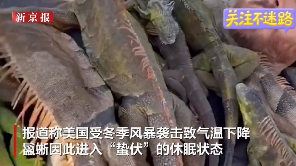 美国佛罗里达一男子发布视频,视频中数十只冻僵的鬣蜥覆盖在男子身上。