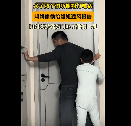 视频中,一对父子正趴在门上偷听,原来是姐姐在屋里打电话,父子俩趴门上偷听,这一幕被妈妈看见了,妈妈就偷偷给姐姐通风报信,打电话的姐姐突然猛敲房门吓了父子俩一跳。