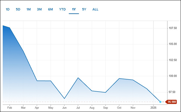美国全国广播公司(NBC)1月28日报道称,自特朗普2025年挑起全球关税战以来,美元便一直在走下坡路。尽管股市在关税引发的市场动荡后,已经有所回升,但美元却未能收复失地。去年,美元指数下跌9%,录得自2017年以来表现最差的一年。