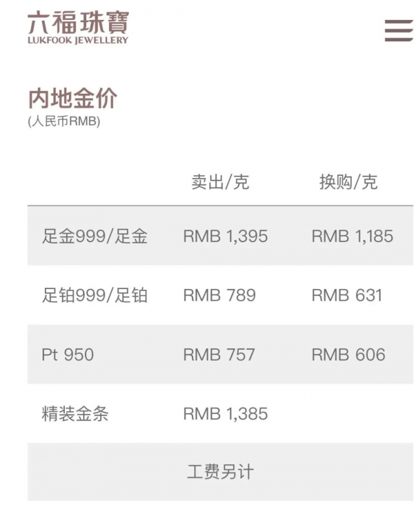 六福珠宝的金饰价格从1445元/克回落至1395元,单日下跌50元。