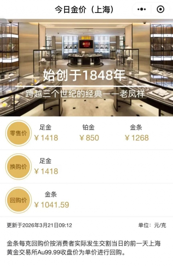 老凤祥的金饰价格自1443元/克下滑至1418元,一夜下跌25元。较3月16日1542元/克跌124元。