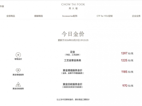 周大福的金饰价格从1447元/克回落至1397元,单日下跌50元。