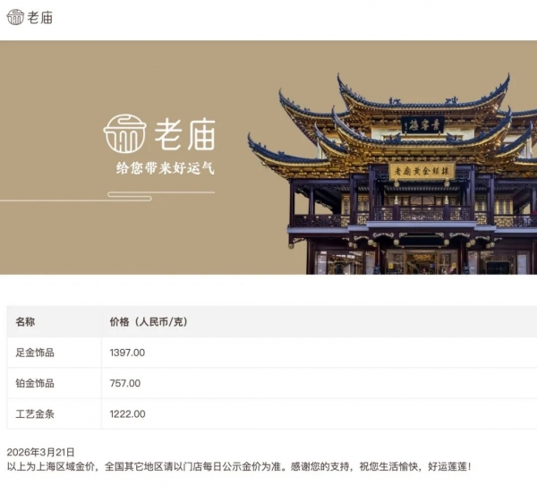 老庙黄金的金饰价格由1445元/克跌至1397元,一夜下跌48元。较3月16日1560元/克跌163元。