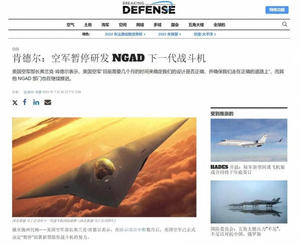 肯德尔提到的下一代战斗机,即美国空军在"下一代空中优势"(NGAD)项目中所开发的第六代隐身战斗机,肯德尔称,该计划需要"暂停数月"(pause of several months),以确认设计和方案路线是否正确。