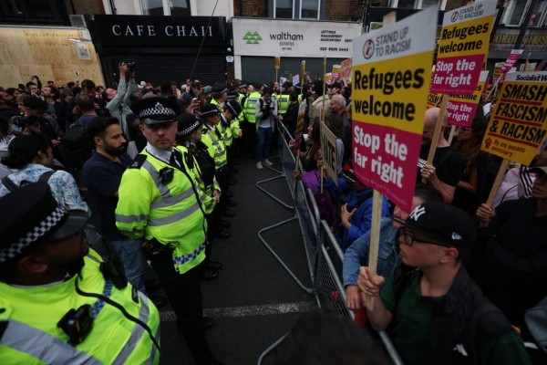 其中声势最浩大的在伦敦东部的沃尔瑟姆斯托。英国《伦敦晚旗报》称,从当地时间傍晚6点30分左右开始,沃尔瑟姆斯托中央车站附近的街道上挤满了示威人群,他们封锁了通往附近难民中心的道路,后者据传是极右翼集会的攻击目标。
