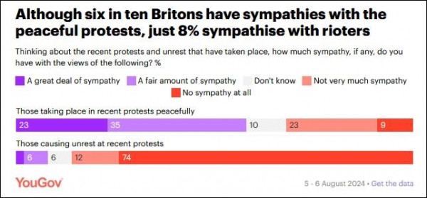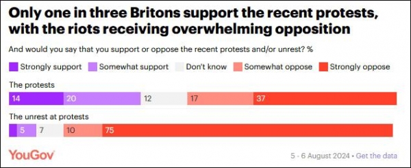 值得一提的是,YouGov本月6日发布的最新民调显示,很少有英国人支持反移民骚乱,认为这种做法并不合理,且骚乱者的观点并不能代表英国民众普遍立场,但也有约三分之一(34%)的受访者事实上支持最近的反移民声浪中和平抗议的部分,六成(58%)对和平抗议者的诉求相当或一定程度上表示同情。