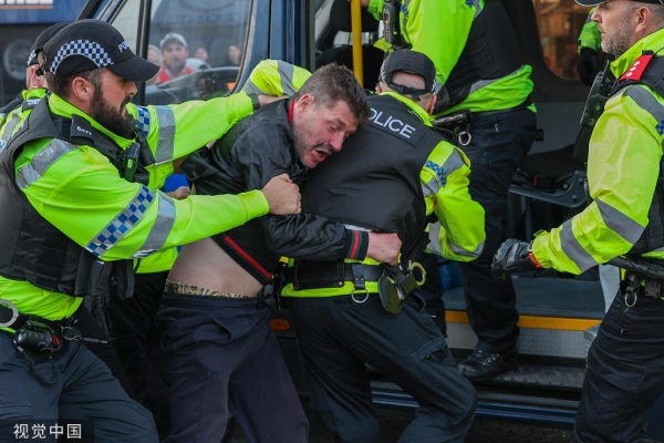 当地时间8月7日,英国布莱克浦,警察在反移民抗议中拘留一名男子视觉中国