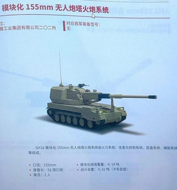 事实上,就在2月21日的阿布扎比防务展上,北方工业的确有一款8×8轮式底盘的155毫米口径自行火炮参加展出,名称为SH-16A型。自此基本事实就很清楚了:SH-16很可能为解放军自用版本,是履带式底盘自行火炮。SH-16A则为出口型号,或者也可能装备于解放军中型合成旅部队、轻型合成旅部队甚至民兵部队,使用轮式底盘。