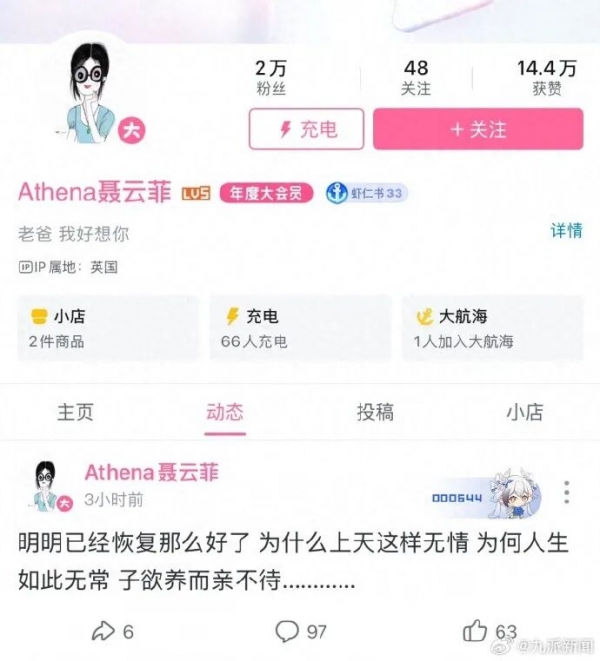 聂云菲将社媒简介修改成"老爸,我好想你"。