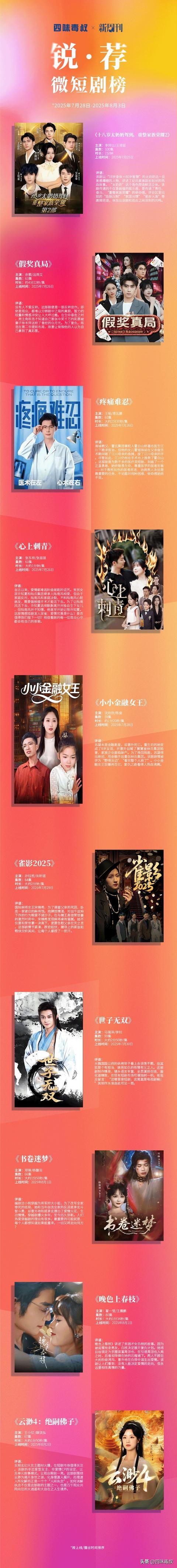 《十八岁太奶奶驾到,重整家族荣耀2》以"18岁身体+80岁智慧"的极致反差为人物核心,讲述其引领纪氏家族跨越跌宕、重振荣耀的热血征程,从"血脉压制"到"家国共情",诸多高频词引发观众深度共鸣;《云渺4:绝嗣佛子》则突破女频玄幻套路,以非爱情CP设定和单元叙事模式独树一帜,深挖"执念消解"主题,触及观众对精神逍遥与人生自在的普遍向往;《晚色上春枝》刻画了遭闺蜜背叛的白枝设局引诱周淙也复仇,却意外在阶级鸿沟与仇恨算计中深陷情感漩涡的故事,精准传递"真情可破壁"的坚定信念;《世子无双》塑造浪荡纨绔表象下的有情有义世子,其精良制作、丰富镜头语言与全员演技在线,被赞"堪比电视剧",树立短剧制作新标杆;《假奖真局》以真假彩票为饵织就复仇迷局,男主濒死识破背叛、重生设局反杀,多重反转将智力博弈与情感纠葛推向极致;《小小金融女王》以"重生+幼童天才"的极致反差设定驱动"野性"叙事,将复杂的金融博弈融入复仇主线,引爆观众肾上腺素,展现另类"女王"的逆袭快感;《雀影2025》将麻将博弈升华为紧张刺激的生死战场,情节紧凑跌宕,在智斗热血与家族沉冤的交织中,精准捕捉赌局内外的窒息感与畅快感;《疼痛难忍》在稀缺的医疗题材中深度探讨医患关系,塑造了在极端私怨下仍坚守使命、敬畏生命的崇高医者形象,彰显医疗职业的厚重与纯粹;《心上刺青》用"刺青"般深刻的牺牲与误解,拷问爱情本质与代价,引发关于奉献与沟通的沉重反思;《书卷迷梦》延续穿越热潮,编剧沈小桃穿成将军之女为改写灭门结局与反派姬承玄斗智斗勇,在"仇人变情人"的戏剧张力中,巧妙探讨了"若是能重来"的命运走向,映射了人们对命运抉择的好奇与遐想。