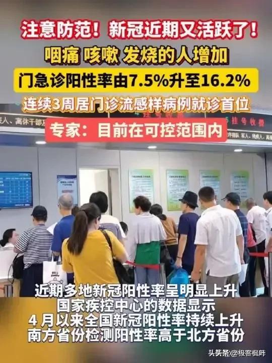 近期全国多地新冠感染持续上升,中疾控数据显示,门急诊新冠阳性率已从7.5%攀升至16.2%,连续3周居流感样病例首位。南方省份感染率略高,老年群体及慢性病患者重症风险需警惕。陈奕迅也因感染新冠,取消演唱会。