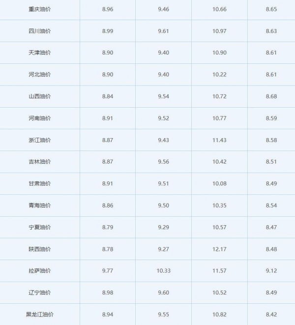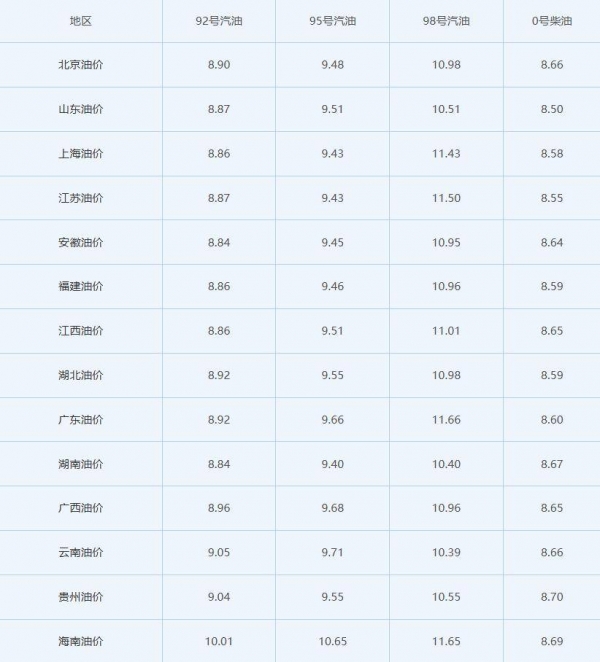 宁波:92号汽油8.87元/升、95号油价9.43元/升、98号中石油11.50元/升、0号柴油8.55元/升。